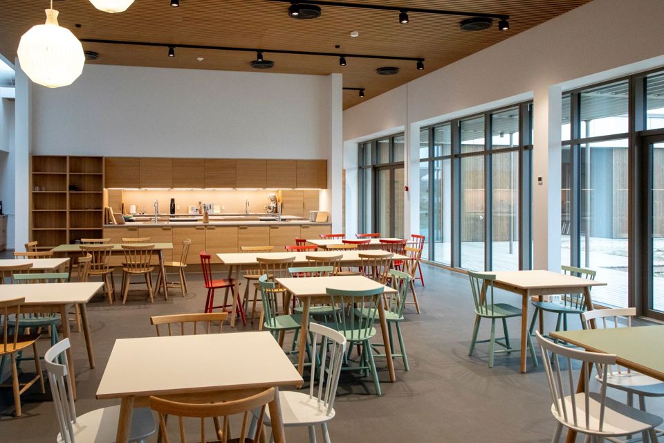 Husets hjerte er et stort, åbent køkken, hvor alle familier har eget køleskab, fryser og kolonialskab.