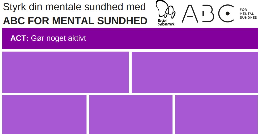 På denne side kan du finde inspiration til aktiviteter du kan lave i din undervisning. Aktiviteterne og øvelserne tager udgangspunkt i tilgangen ABC for mental sundhed. Du kan anvende materialerne i den almindelige undervisning for løbende at sætte fokus på elevernes trivsel og mentale sundhed, eller du kan anvende materialerne i moduler eller forløb, hvor I i klasser eller på hold arbejder med trivsel og fællesskabet.